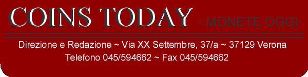 Coins Today - monete oggi è una rivista trimestrale in lingua italiana edita da Globus s.r.l. e distribuita in abbonamento postale. Coins Today ha lo scopo di tenere informati gli appassionati di numismatica su tutte le più importanti novità del settore. I temi trattati vanno dalle attività delle Zecche di tutti i Paesi del mondo alle tendenze del collezionismo internazionale, alle varie manifestazioni e convegni. La rivista presenta aggiornati listini e offerte commerciali di tutte le emissioni della Repubblica Italiana, di San Marino, del Vaticano e delle più importanti novità provenienti da tutto il mondo. email: coinstoday@numismatica2p.it |